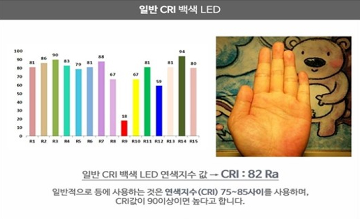 하지만 실제로 연색성이 좋으려면 R9 ~ R14 까지의 평균값을 높여야 하고 특히 R9 ~ R12 값을 올리는 것이 매우 중요한데, 이 값을 올리는 것이 쉽지 않습니다.