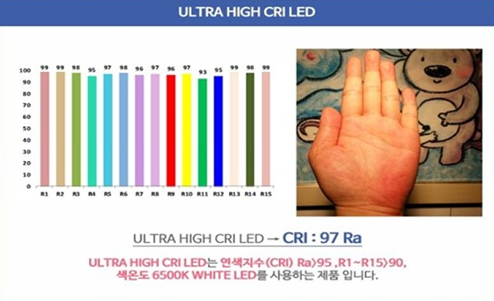 ULTRA HIGH CRI LED 제품은 R1 ~ R8 까지의 값은 물론 R9, R12의 값이 세계 최고 수준으로 태양광에 가까운 원색을 구현하여 가장 자연에 가까운 색을 표현하고, 눈의 피로를 덜어주는 안락함과 편안함을 줍니다